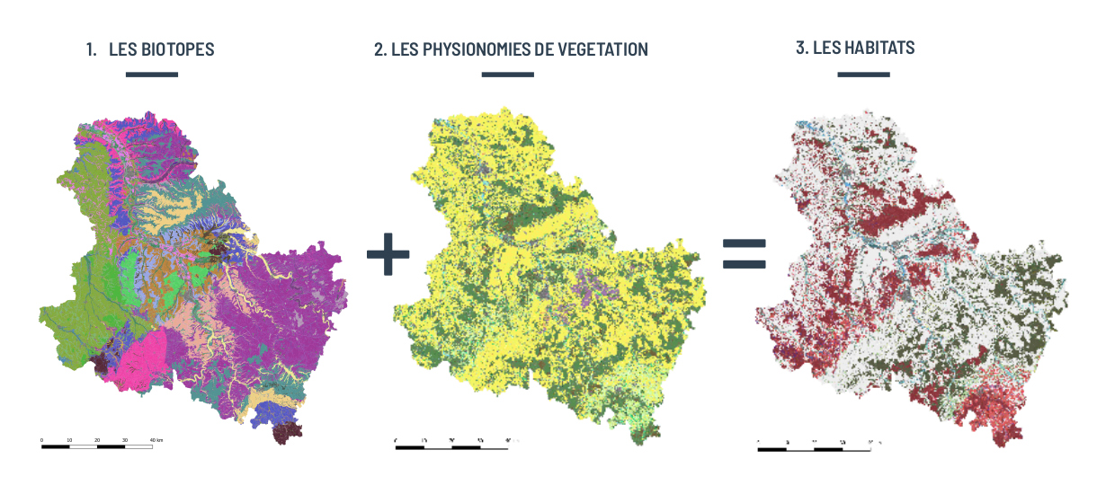 - Le croisement des deux cartes permet d'obtenir une carte des habitats où chaque objet géographique (d'une superficie minimale de 5000 m2) est homogène à la fois sur les paramètres de biotopes et sur la physionomie de végétation.